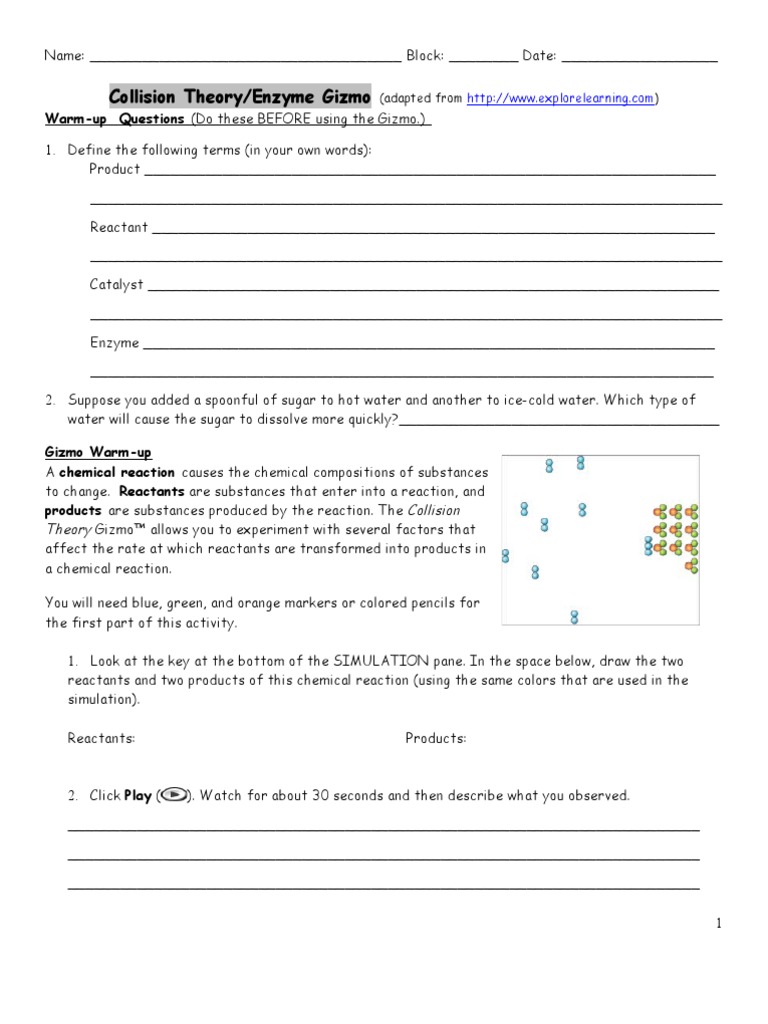 Collision theory provides a qualitative explanation of chemical reactions and the rates at which they occur. Ninth grade lesson differentiated exploration of collision theory these pictures of this page are about:collision theory gizmo. Explains how the particles should interact or with each other to cause a reaction. Access to all gizmo lesson materials including answer keys. When two molecules collide with enough force, old chemical bonds are broken and new bonds form, resulting in.